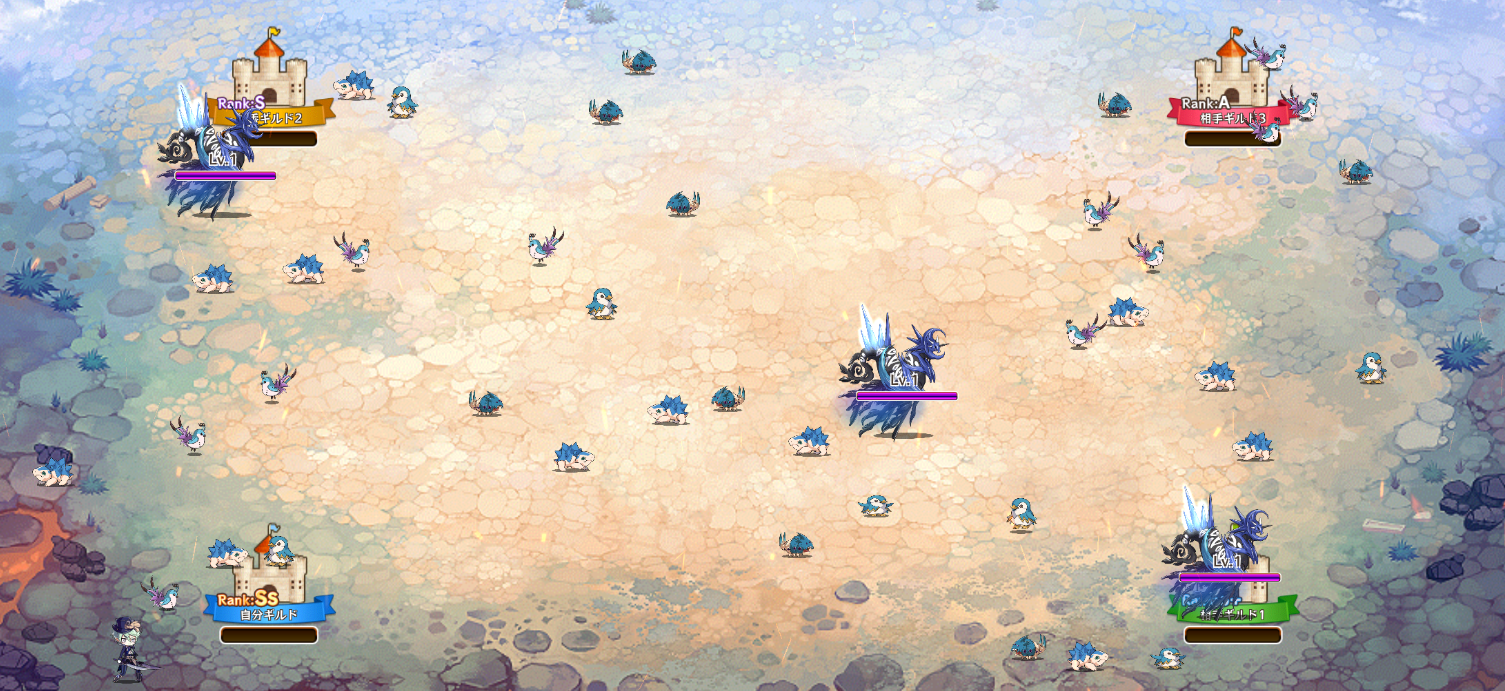 このようにフィールド上に多くのユニットとモンスターが出現し、それぞれが移動と攻撃アニメーションなどを行っています。多い場合だとフィールド上に、120体を超えるユニットとモンスターが出現します。