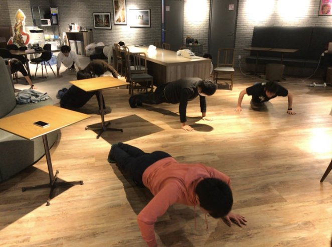 ↑エンジニアが社内カフェスペースにてみんなで腕立て中