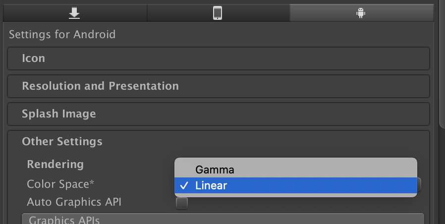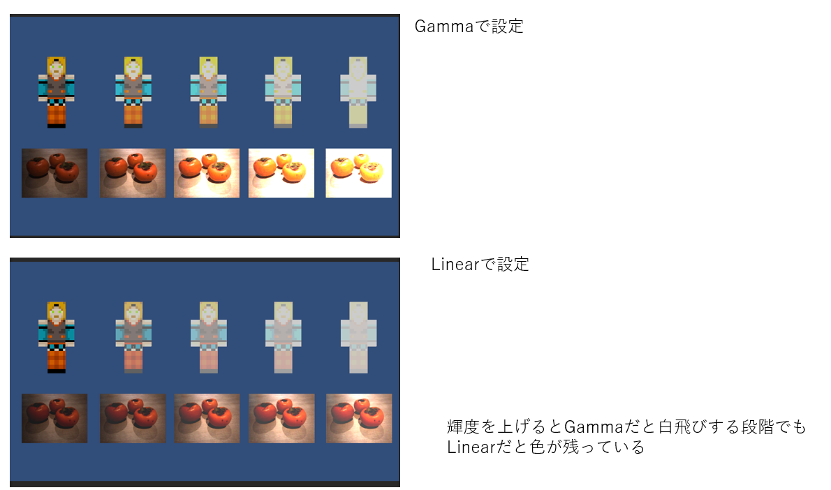 このUnityのレンダリング設定ですが、もし開発者間でLinearとGammaが混在するような設定をしてしまうなどすると、輝度が違って見えてまう、などのトラブルが起きてしまうかもしれません。