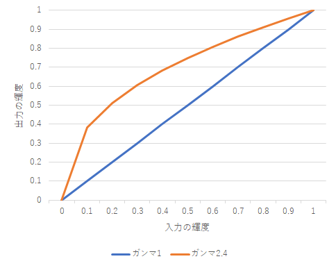 例えば、ガンマ1における入力0.4の値とガンマ2.4における入力0.1の値が、ほぼ同じくらいになることが分かるかと思います。