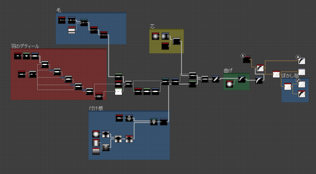 アンドゥで戻ったりせず、次へ次へとノードを繋ぎ、変形やブレンドを活かし羽のデティールを作っていきます。