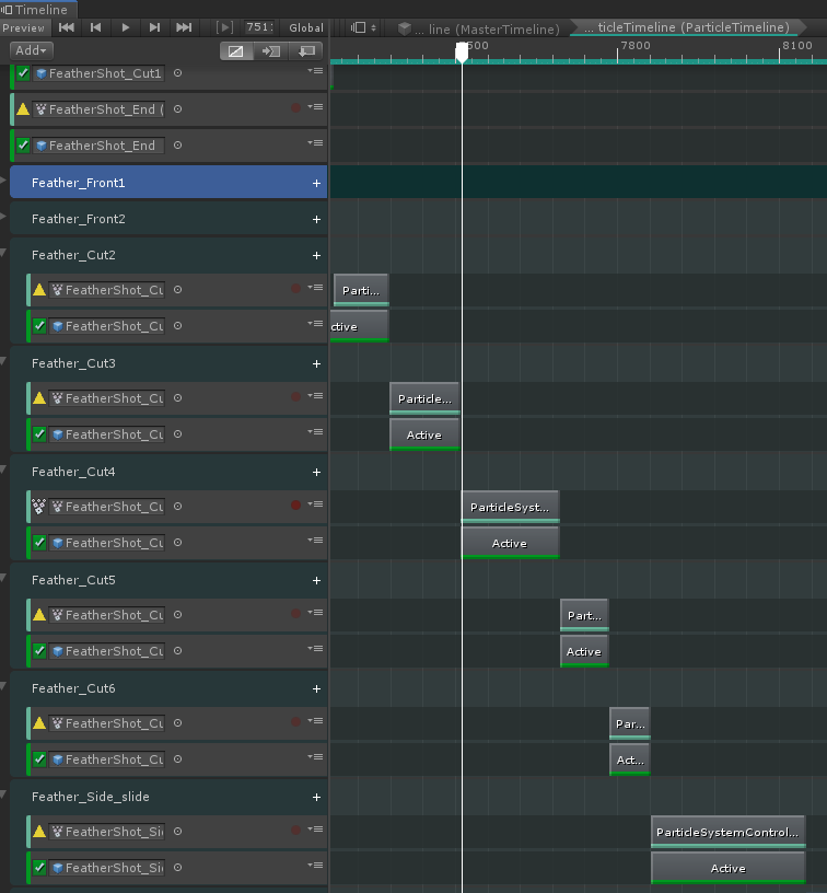 TimeLineを使いカメラのカットごとに整えていきます。まるで映像編集ソフトのように管理しているようにも伺えます。エフェクトのエミッターの数だったり、拡張して個々のシーケンス側で触るパラメーターを用意したりしてます。